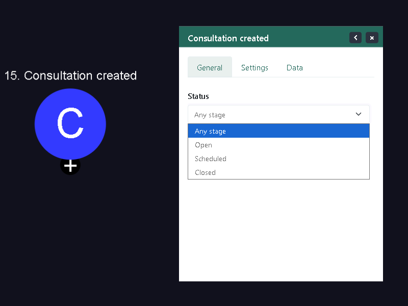 The “Consultation Created” trigger is an automated workflow initiator that activates when a client submits a request for consultation. This trigger serves as the starting point for your workflow, allowing you to promptly respond to and manage incoming consultation requests. By leveraging this trigger, you can ensure that each new consultation inquiry is efficiently processed and handled according to your established procedures.