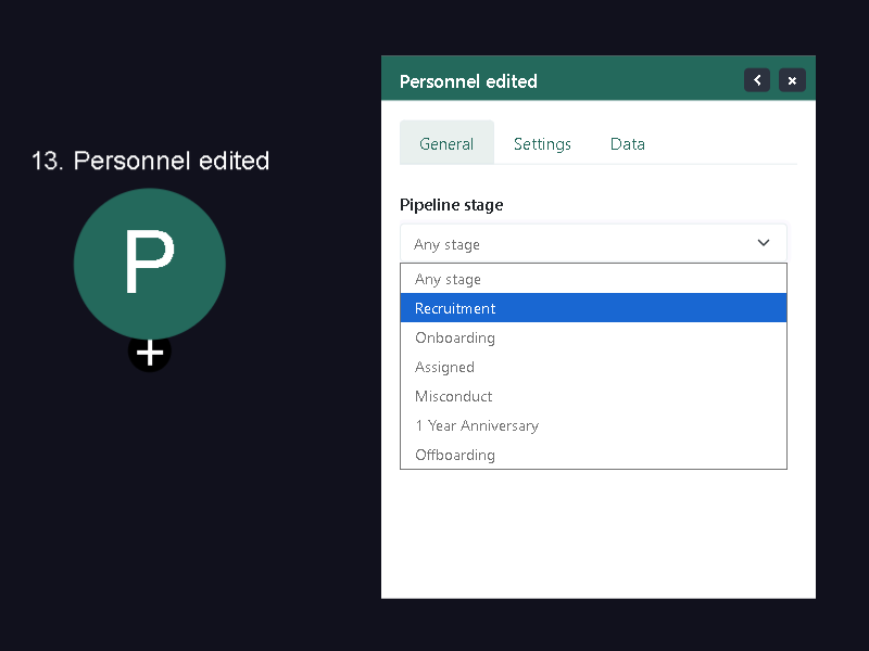 The “Personnel Edited” trigger initiates a workflow when a personnel or employee record is updated or modified in the pipeline. This trigger activates at the start of the workflow, allowing you to automate processes or actions based on changes made to employee information. It’s a useful tool for keeping your HR processes up-to-date and responsive to personnel data modifications.